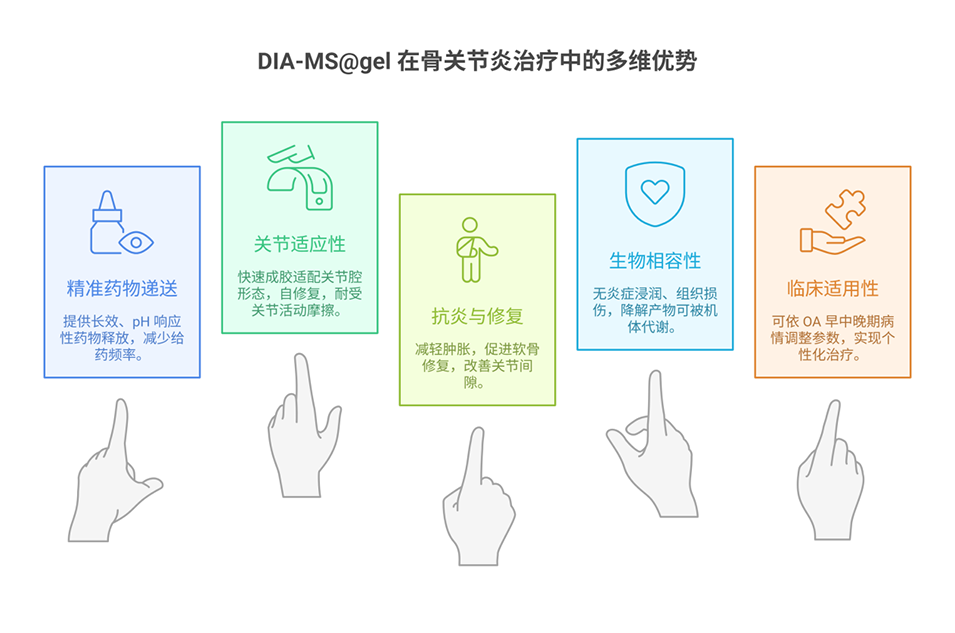 水凝胶基质由氧化透明质酸(OHA)、季铵化壳聚糖(QCS)、己二酸二酰肼(ADH)构成,添加PVA(聚乙烯醇) 增强柔韧性,nHAP(纳米羟基磷灰石) 提升力学强度,同时 DIA-MS(双醋瑞因微球)以 25mg/mL 浓度均匀分散,不破坏网络结构;