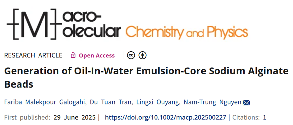 水包油(O/W)乳液广泛用于印刷油墨、食品、医药(如疫苗载体)等领域,但其热力学不稳定,易发生重力分离、液滴聚并或奥氏熟化。传统乳液填充凝胶存在释放效率低、包封率差、易突释等问题。近期,澳大利亚格里菲斯大学团队开发了一种以水包油乳液为核、海藻酸钠为壳的核壳微珠。通过优化表面活性剂浓度与油相体积分数,成功制备出稳定性高、液滴尺寸均匀的乳液,并将其封装于不同壳厚的海藻酸钠微珠中,系统评估了微珠的形貌、油含量、溶胀行为与机械性能,为乳液在控释输送系统中的封装与保护提供了新策略。相关研究以“Generation of Oil‐In‐Water Emulsion‐Core Sodium Alginate Beads”为题发表于期刊《Macromolecular Chemistry and Physics》。