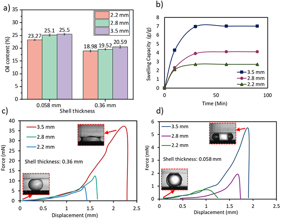 图4.(a)直径为2.2mm、2.8mm和3.5mm,且壳厚度为0.058mm与0.36mm的微球的含油量。(b)壳厚度为0.058mm的乳液核-海藻酸钠微球在去离子水中不同时间间隔的溶胀率。(c)壳厚度为0.058mm的乳液核水凝胶微球的力-位移特性曲线;(d)壳厚度为0.36mm的乳液核水凝胶微球的力-位移特性曲线。