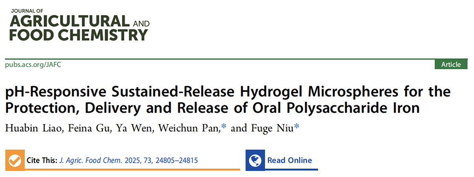 口服多糖铁复合物(UCP-Fe(III))易在胃酸环境中降解,导致生物利用度降低。鉴于此,浙江工商大学潘伟春教授、牛付阁副教授团队成功开发了一种具有核壳结构的海藻酸钠/壳聚糖水凝胶微球(PAC),该微球可通过pH响应性实现UCP-Fe(III)的胃部保护与肠道缓释,有效提升其口服生物利用度。相关研究以“pH-Responsive Sustained-Release Hydrogel Microspheres for the Protection, Delivery and Release of Oral Polysaccharide Iron”为题,发表于期刊《Journal of Agricultural and Food Chemistry》。