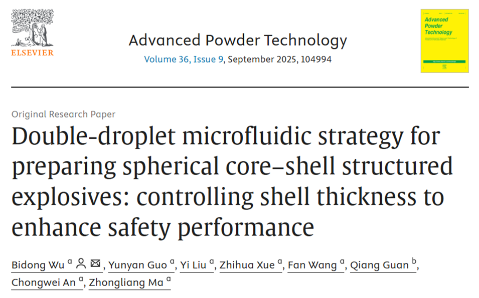 鉴于此,中北大学武碧栋副教授团队首次采用双液滴微流控策略(DDMS),成功制备出壳层厚度可控的HMX@DAAF核壳微球,该材料展现出极高的安全性,其冲击感度从4 J显著提升至100 J,摩擦感度从96 N提升至360 N。相关研究以“Double-droplet microfluidic strategy for preparing spherical core–shell structured explosives: controlling shell thickness to enhance safety performance”为题目,发表于期刊《Advanced Powder Technology》。
