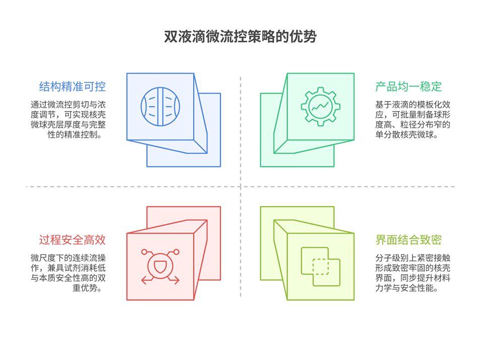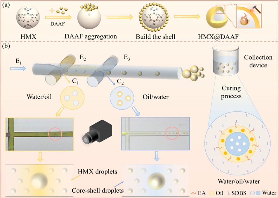 1、本研究首次采用双液滴微流控策略(DDMS)成功制备了具有可控壳层厚度的HMX@DAAF核壳结构微球。HMX作为高能炸药,其高感度限制了应用,而选用低感度高氮化合物3,3′-二氨基-4,4′-氧化偶氮呋咱(DAAF)作为壳层,可有效降低其机械感度。