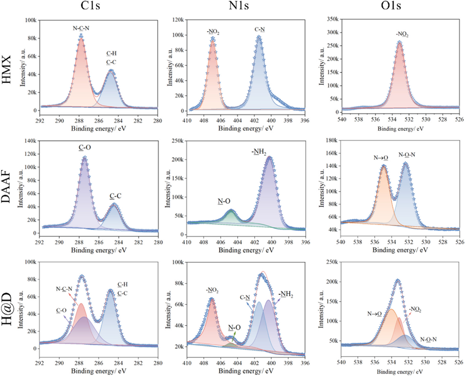 图5:(a)HMX、(b)DAAF、(c)H@D(HMX@DAAF)的C 1s、N 1s、O 1s高分辨X射线光电子能谱分析