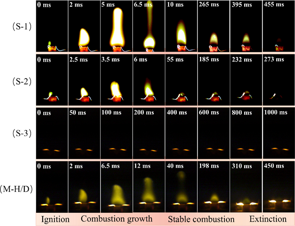 图9:(a)S-1、(b)S-2、(c)S-3、(d)M−H/D(HMX/DAAF混合微球)的燃烧图像