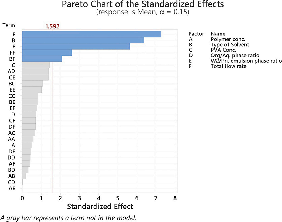 图2. 各因素(A-F)及交互作用对体积加权平均粒径(Vm)标准化影响的帕累托图。竖线代表显著性阈值,用于指示影响Vm的因素。结果显示,总流速(F)、溶剂类型(B)、W2与初级乳液的比例(E)、B与F的交互作用(BF)以及流速的二次项(FF)被确定为具有显著性影响的因素。