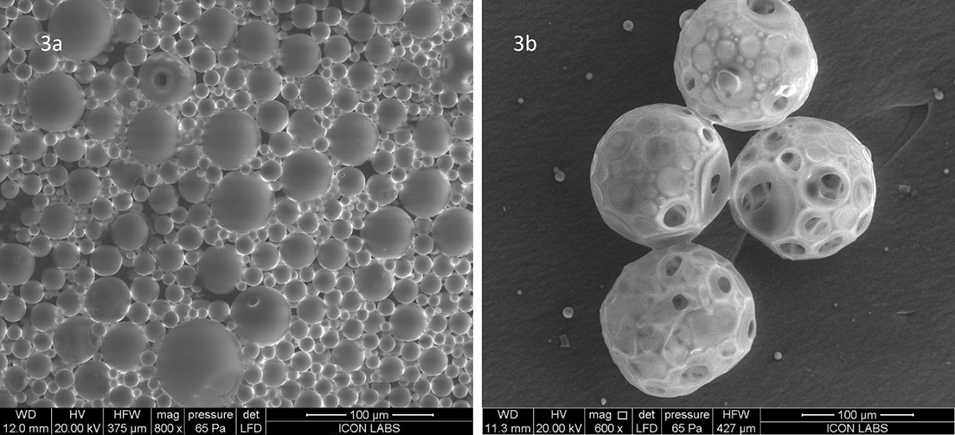 图3. 以乙酸乙酯(EA)为溶剂、W2:O/W1为5.474、流速为21.77 mL/min条件下制备的PLGA微球SEM图。(a)PLGA浓度为75 mg/mL时,微球呈现光滑形态(放大800倍);(b)PLGA浓度为25 mg/mL时,微球呈现多孔形态(放大600倍)。