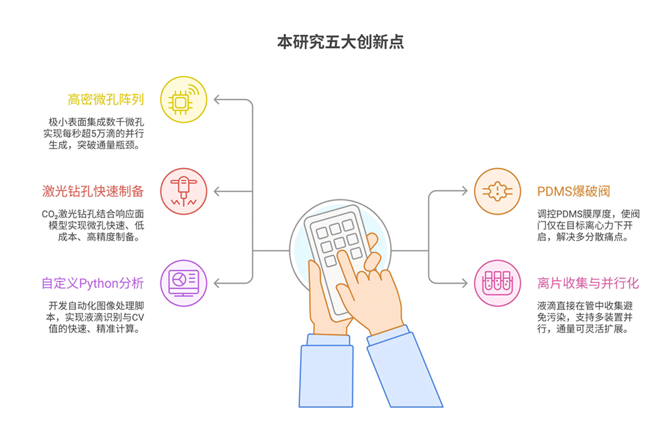6、该装置可生成直径200–800 μm的单分散液滴,产率达每秒12,000至50,000个以上,且可通过并行化进一步提升,在药物筛选、化学合成等领域具有广泛应用潜力。
