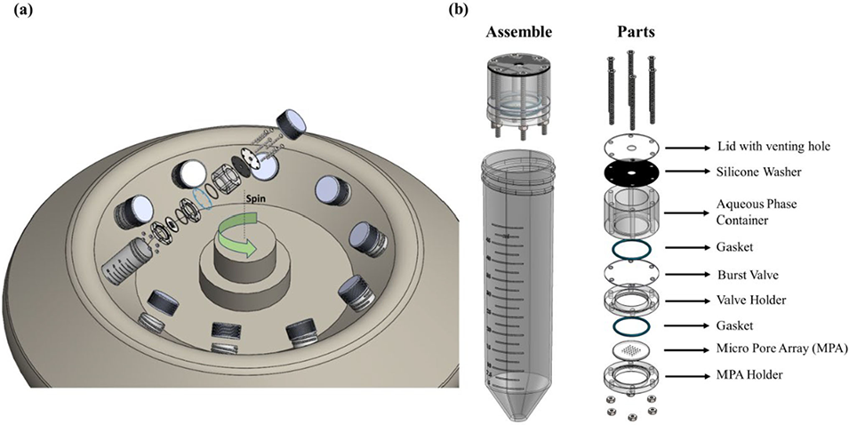 图2: 离心式液滴发生器装置的部件与组装。(a) 展示了可并行运行的装置,使用一台常规离心机即可同时运行多个含有不同溶液的装置,显著提高液滴生成速率。(b) 展示了该离心式装置的所有零件和组装状态。所有组件易于组装,整个装置可装入50 mL Falcon管中。