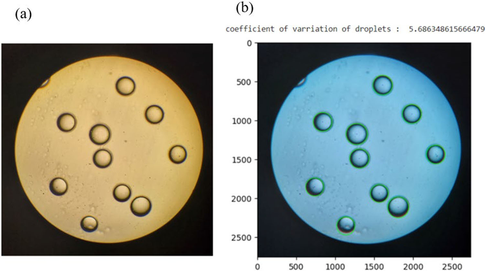 图3: 使用自定义Python脚本进行液滴CV分析。(a) 生成的液滴的样本显微图像。(b) 自定义Python脚本的输出结果,显示所有识别出的液滴被绿色轮廓标出,计算出的CV值自动显示在图片上方。脚本根据像素值而非实际尺寸计算CV。