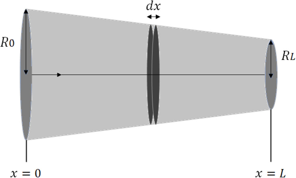 图 6: CO2激光钻孔的微孔示意图。在 x=0处,R0代表微孔的入口半径;在 x=L处,RL代表出口半径。在微分元素 dx处,半径可被视为恒定。