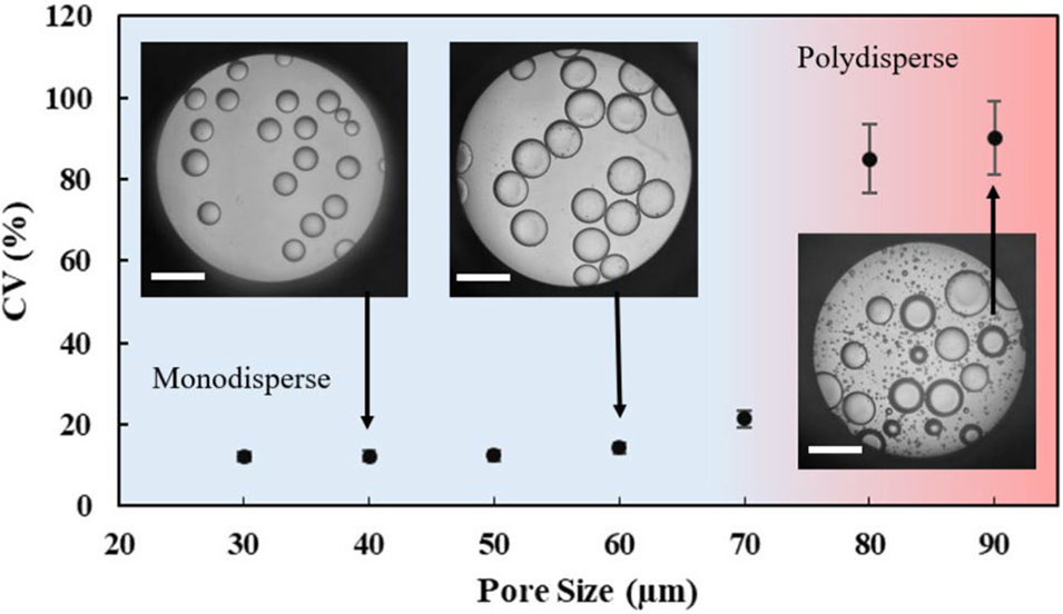 图8: 在80 g离心力下,通过不同孔径生成的液滴的CV值。孔径最大至60 µm时,CV值保持在可接受的15%以下;超过60 µm则CV增加,变得不理想。误差线反映了标准偏差。