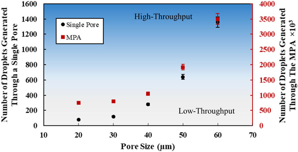 图10: 在80 g离心力下,1分钟内通过单个微孔及不同孔径的MPA生成的液滴数量。较小的孔径每个孔产生的液滴较少,而较大的孔径每个孔产生的液滴速率呈指数级增长。具体数据:单个20 µm孔每分钟产生约100个液滴,单个60 µm孔每分钟产生高达1400个液滴。对于高通量生成:60 µm MPA每秒可产生超过50,000个液滴;20 µm MPA每秒产生12,500个液滴。背景越蓝表示装置通量越高。误差线代表标准偏差。