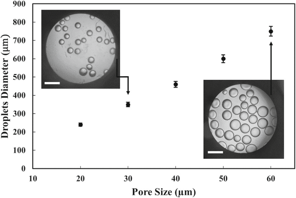 图9: 在80 g离心力下,通过不同孔径生成的液滴的直径。更大的孔径几乎呈线性地产生更大的液滴。误差线反映了标准偏差。