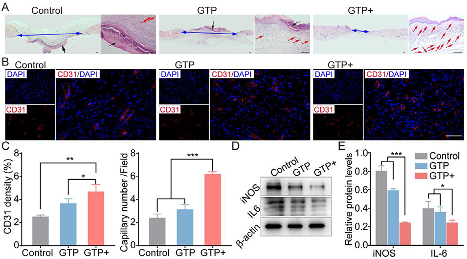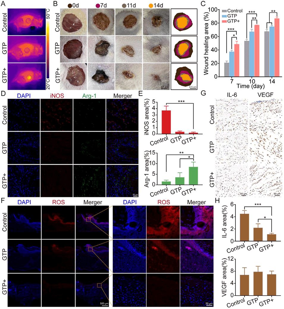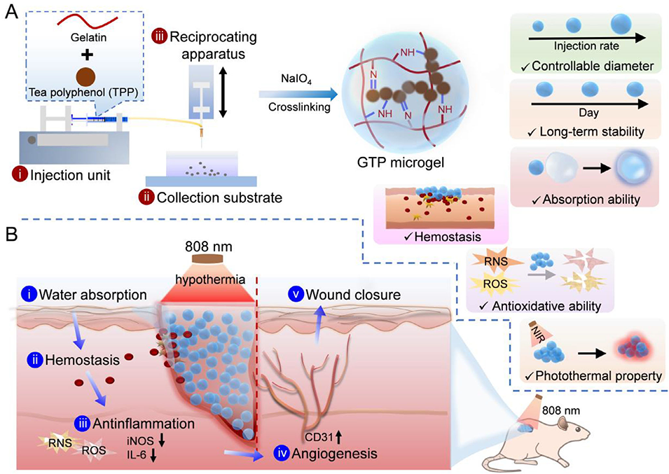 2、这些微凝胶具备优异的止血性能、强大抗氧化活性和良好光热效应。在小鼠烧伤模型中,结合光热刺激的GTP微凝胶能通过减轻炎症和促进血管生成来加速伤口愈合。