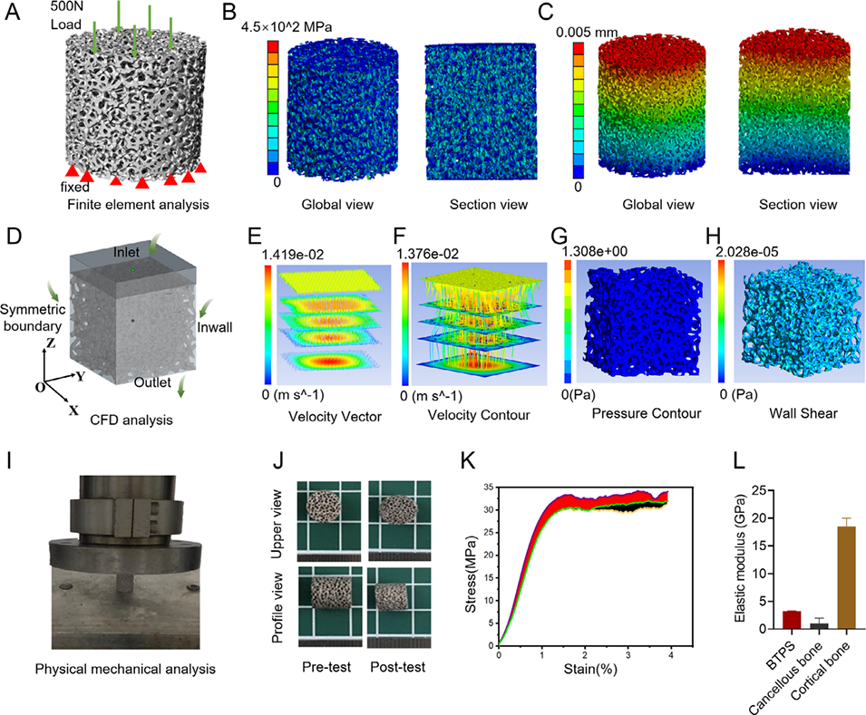 图3:BTPS的力学表征、有限元分析及流体动力学分析