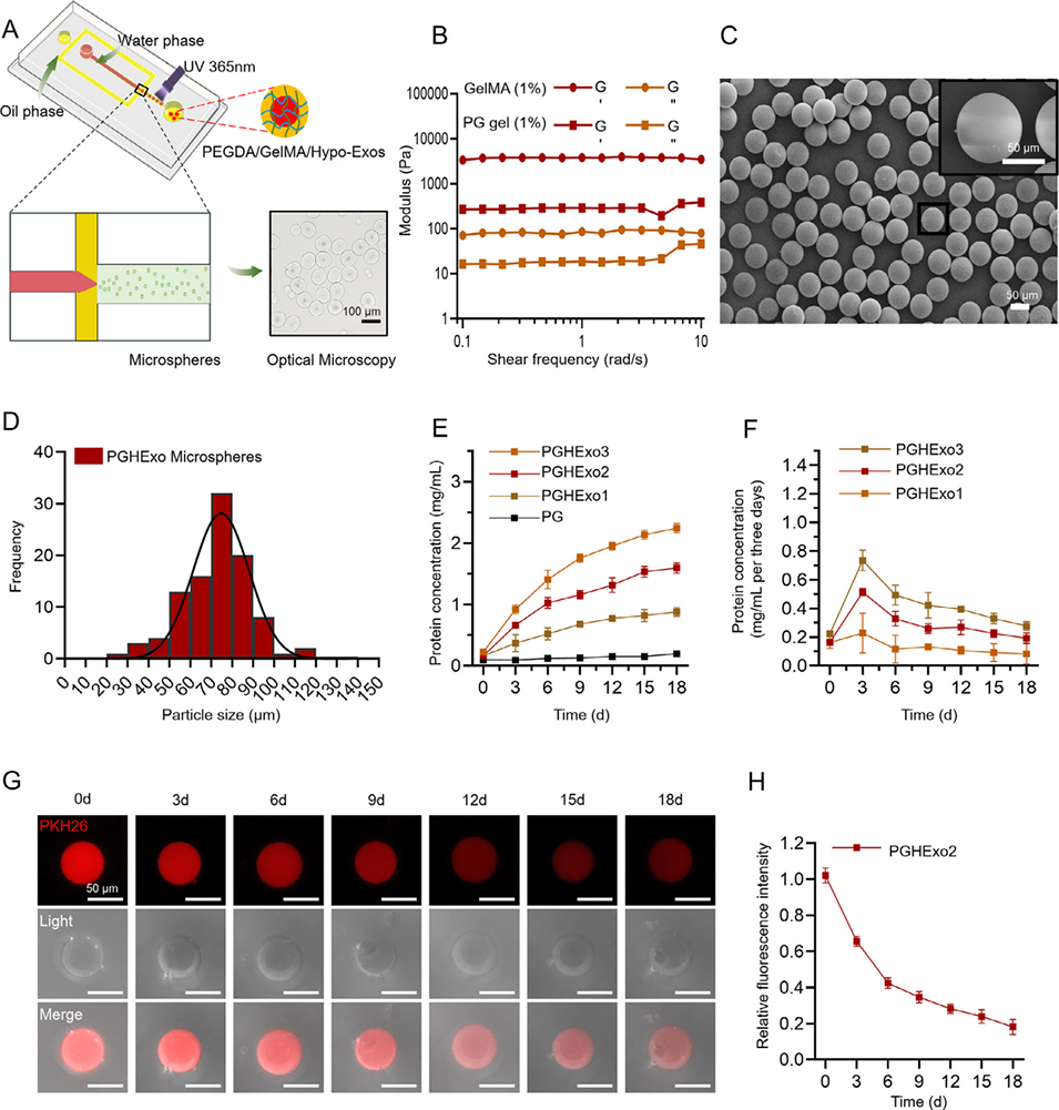 图5:负载缺氧诱导外泌体(Hypo-Exos)的PEGDA/GelMA双网络水凝胶缓释微球的制备、表征及释放曲线