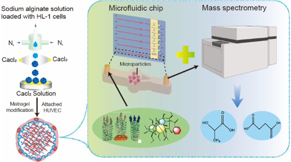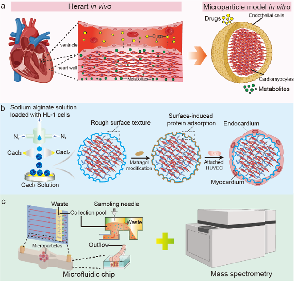 图1. 模拟心内膜-心肌的三维心脏微球设计(a)心脏内药物递送与代谢示意图;(b)心脏微球模型构建示意图;(c)用于心脏微球代谢物分析的微流控芯片-质谱联用系统工作原理