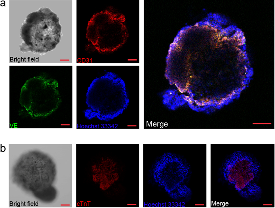 图4. 心脏微球的细胞功能验证。(a)微球模型中CD31标志物/VE-钙黏蛋白/细胞核的共聚焦图像及明场图像;(b)微球模型中心肌肌钙蛋白(cTnT)标志物/细胞核的共聚焦图像及明场图像