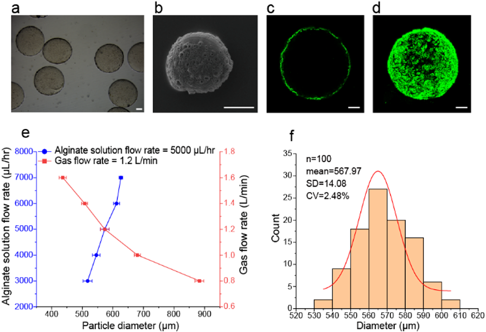图2. 粗糙海藻酸钠微球的制备。(a)粗糙微球的明场图像;(b)微球形貌的SEM图像;(c、d)异硫氰酸荧光素(FITC)标记基质胶修饰粗糙微球表面的二维和三维荧光图像;(e)微球尺寸的可控调节;(f)对应(a)中微球的尺寸分布。数据以平均值±标准差表示,n=100。比例尺:100μm