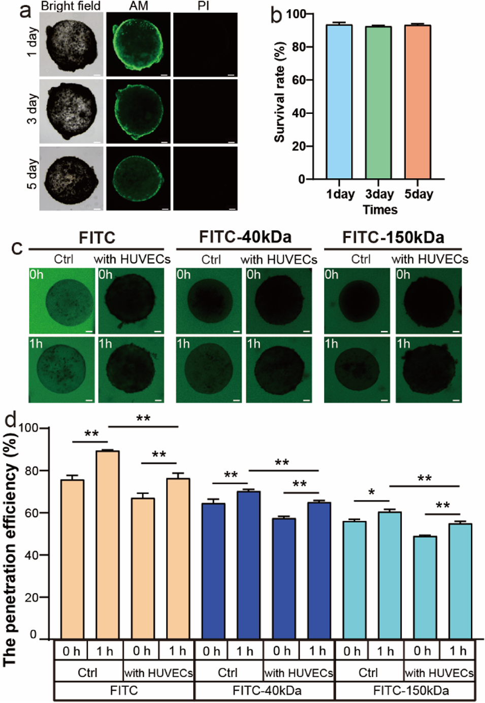 图3. 心脏微球的细胞活性与内皮屏障功能验证。(a)5天内微球中细胞活力的荧光成像;(b)5天内微球的细胞存活率。数据以平均值±标准差表示,n=3;(c)微球内皮屏障通透性评估——异硫氰酸荧光素(FITC)、40kDa及150kDa FITC标记葡聚糖向有无内皮细胞单层的微球内扩散的延时荧光图像;(d)有无内皮细胞单层的微球渗透效率(渗透效率=微球内部与周围示踪剂荧光强度比值)。数据以平均值±标准差表示,n=5。*p<0.05,**p<0.01。比例尺:100μm