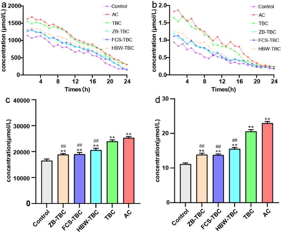 图6. 基于芯片-质谱(Chip-MS)的乳酸和琥珀酸检测动态变化。(a)24小时内乳酸的实时定量分析;(b)24小时内琥珀酸的实时定量分析;(c、d)24小时内乳酸和琥珀酸的总浓度分析。n=3。与对照组比较,**p<0.01;与铁棒锤(TBC)组比较,##p<0.01