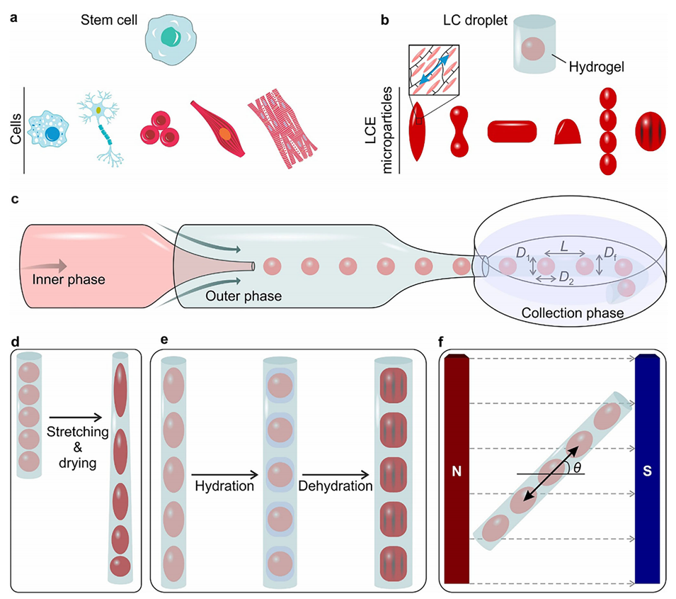 1、本研究受细胞分化启发,提出一种基于微流控的纤维限制制备策略,用于可控制造无束缚软体微执行器。该方法利用软材料的机械柔性和分子各向异性,通过机械与化学刺激,对液晶弹性体(LCE)微粒的3D形状、表面纹理和分子结构进行正交编程。