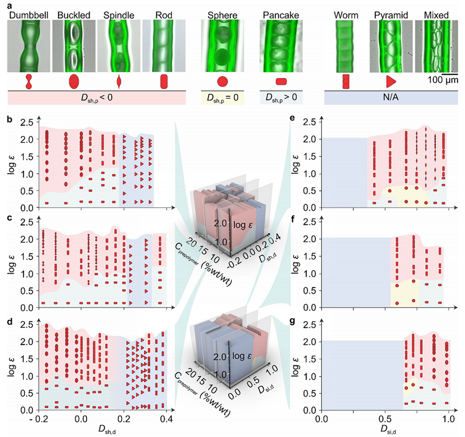 图3. 描述微颗粒形貌与液滴-纤维几何结构、液滴成分及干燥过程中力学场关系的相图