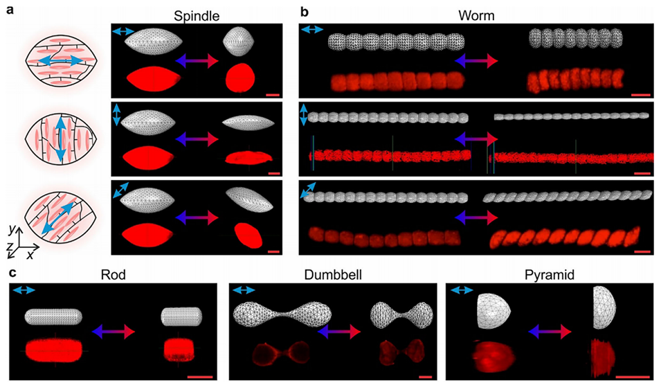 2、核壳结构的功能解耦设计:构建“LC液滴核-水凝胶壳”结构,水凝胶壳承担刺激传导与形态塑造功能,LC核负责分子取向编码,实现形态、纹理、分子结构的独立调控。