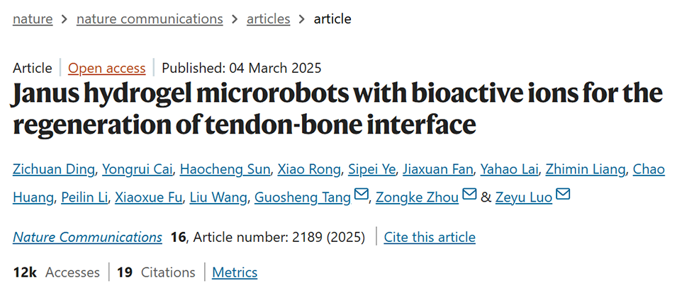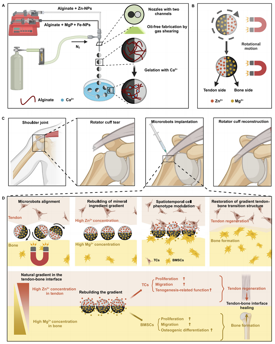 再生肌腱-骨界面(TBI)的自然梯度是肩袖撕裂(RCT)重建的一个主要挑战。近期,四川大学华西医院周宗科教授、罗泽宇副教授联合广州医科大学唐国胜教授,借助生物友好型气体剪切微流控平台,成功制备出兼具注射性与磁性调控功能的Janus水凝胶微型机器人。该微型机器人通过精准负载Mg²⁺/Zn²⁺双离子,实现TBI矿物质、细胞表型及结构三重梯度再生,显著提升了肩袖撕裂修复的愈合质量与力学性能。相关研究以“Janus hydrogel microrobots with bioactive ions for the regeneration of tendon-bone interface”为题目,发表于期刊《Nature Communications》。