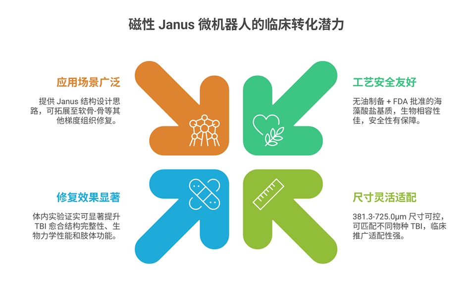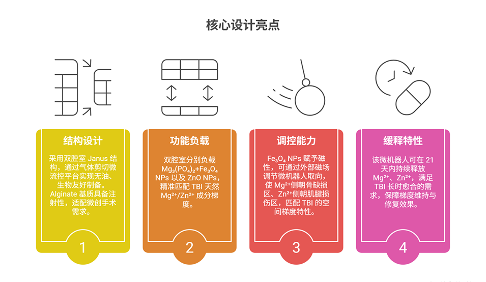 3、植入体内后,可通过外部磁场调控微型机器人取向,使Mg²⁺侧朝向骨缺损区、Zn²⁺侧朝向肌腱损伤区,快速重建并长期维持TBI的Mg²⁺/Zn²⁺矿物质梯度。