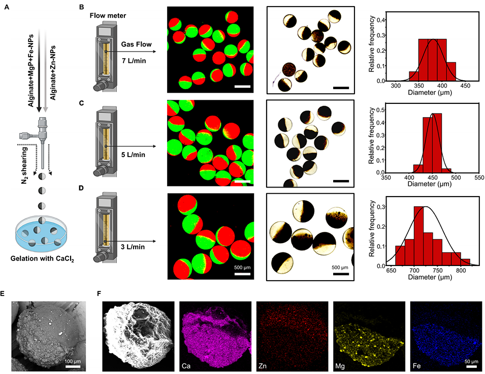 2、通过生物友好的气体剪切微流控平台制备微型机器人,其两独立腔室分别负载Mg₃(PO₄)₂、Fe₃O₄纳米颗粒(骨侧,释放Mg²⁺)和ZnO纳米颗粒(肌腱侧,释放Zn²⁺)。