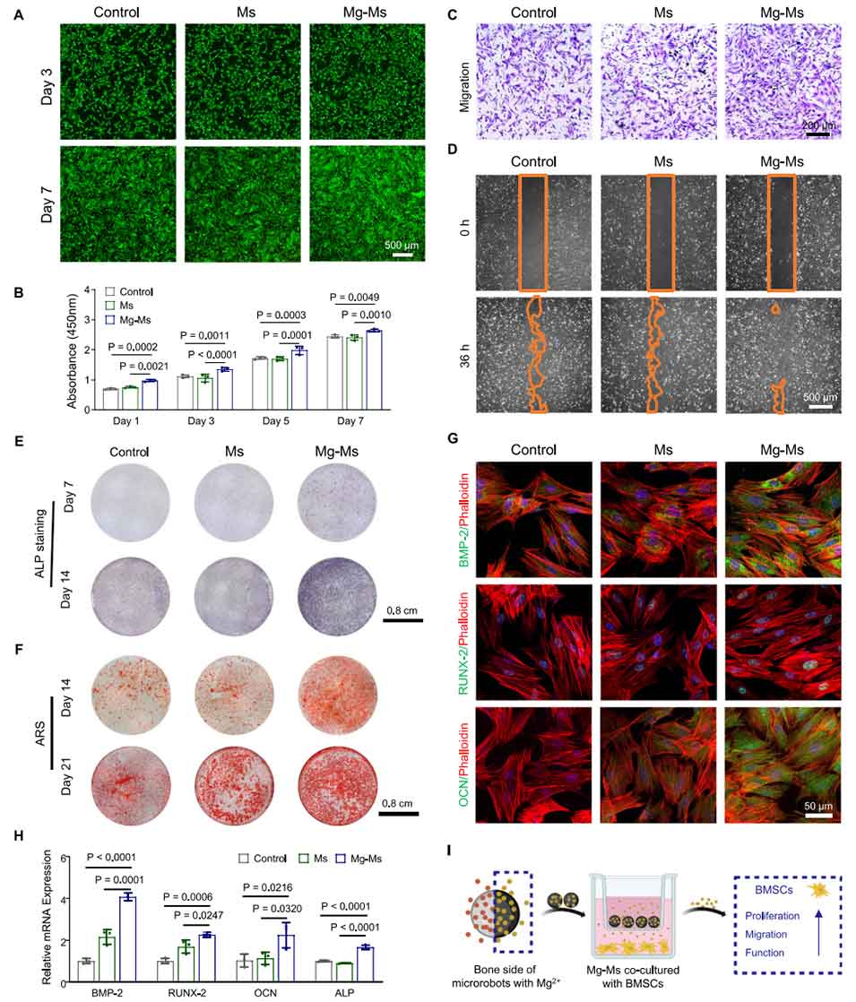 图5. 负载Mg2+的微型机器人体外促骨形成能力评估