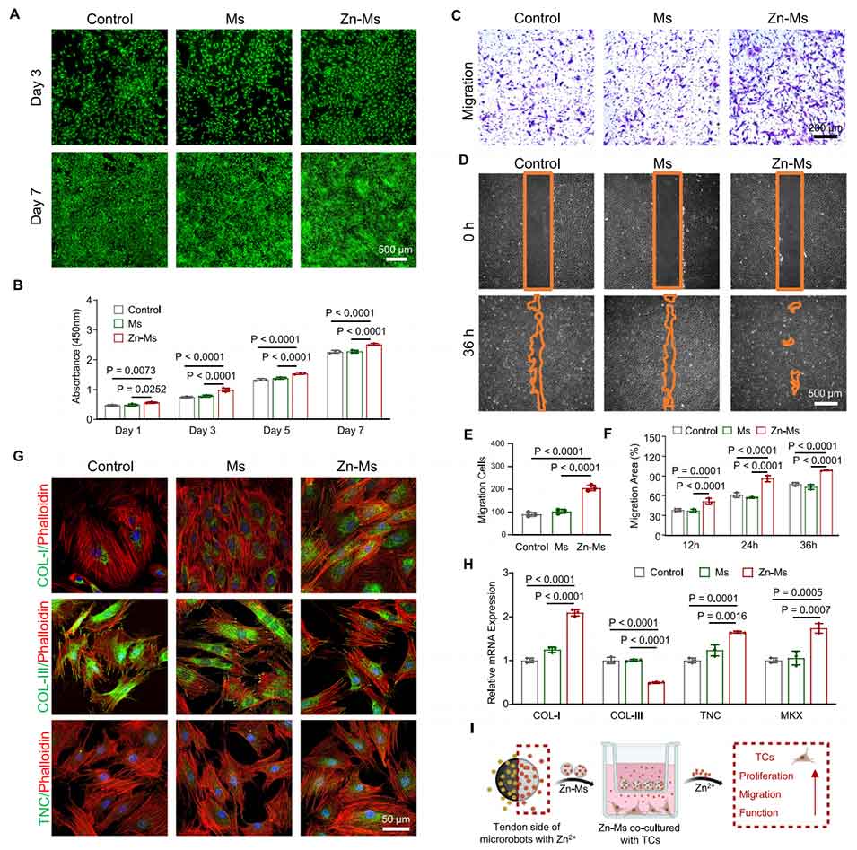 图4. 负载Zn2+的微型机器人体外促肌腱再生能力评估