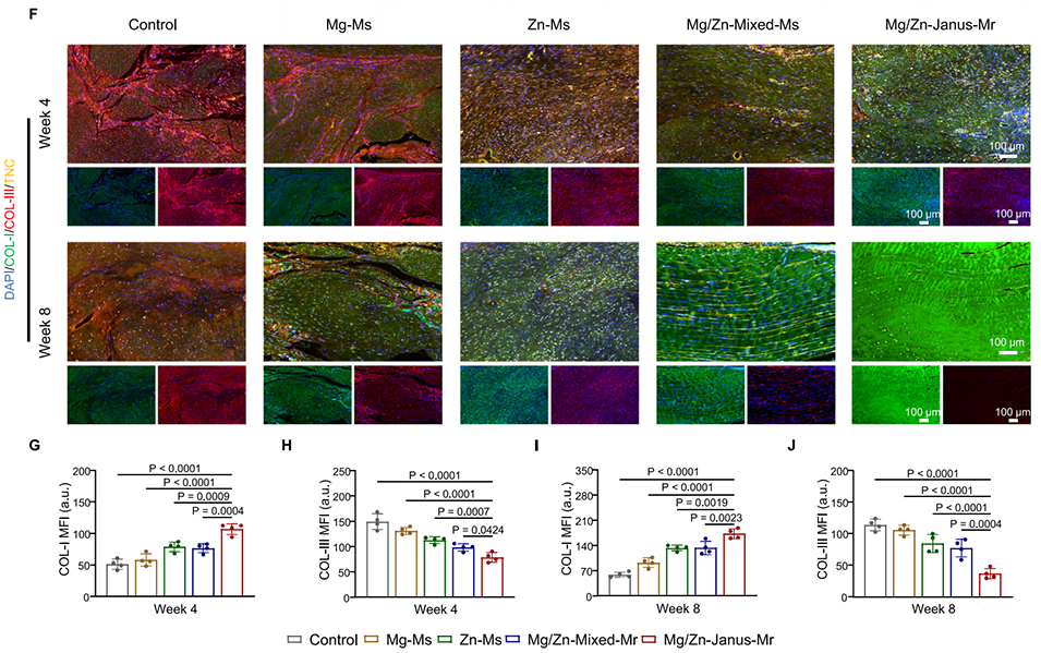 4、体外实验证实,微型机器人能时空调控细胞表型:Mg²⁺促进骨髓间充质干细胞(BMSCs)增殖、迁移及成骨分化,Zn²⁺促进肌腱细胞(TCs)增殖、迁移及胶原合成(提升COL-I/COL-III比值)。