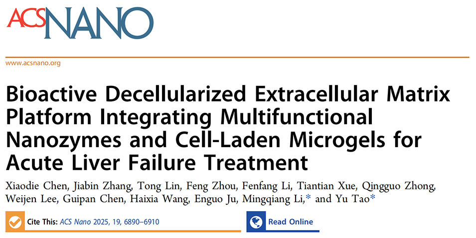 为此,中山大学附属第三医院陶玉研究员、李明强研究员团队构建了一种整合多功能纳米酶与干细胞负载微凝胶的生物活性脱细胞外基质(dECM)治疗平台。该平台以猪肝来源的脱细胞外基质(PLdECM)为基础,通过甲基丙烯酸酐(MA)修饰获得光敏性水凝胶(PLdECMMA),利用微流控技术制备干扰素γ(IFNγ)预处理的人脂肪源性间充质干细胞(γhASCs)负载微凝胶,并与二氢硫辛酸(DHLA)保护的铜掺杂铂纳米簇(PtCu-DHLA)纳米酶共递送,形成协同治疗体系(PMPC)。在四氯化碳(CCl₄)诱导的ALF小鼠模型中,该平台通过抗氧化、抗炎、促增殖、促血管生成的协同作用,有效修复肝损伤、恢复肝功能,为ALF治疗及再生医学领域提供了全新策略。相关研究以“Bioactive Decellularized Extracellular Matrix Platform Integrating Multifunctional Nanozymes and Cell-Laden Microgels for Acute Liver Failure Treatment”为题目,发表于期刊《ACS Nano》。