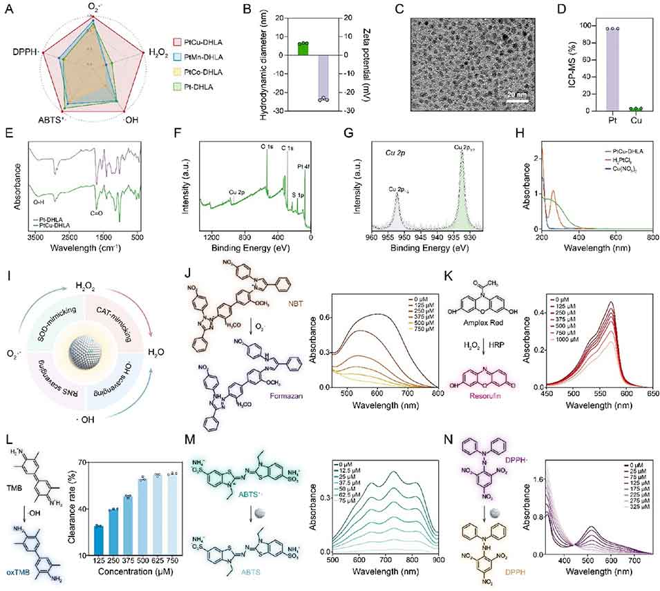 PtCu-DHLA纳米酶:通过筛选配体(DHLA)和掺杂金属(Cu)获得最优性能,粒径仅4±0.3nm,zeta电位为-23.7mV,具有良好的稳定性和生物相容性。其兼具超氧化物歧化酶(SOD)和过氧化氢酶(CAT)模拟活性,可高效清除O₂⁻、H₂O₂、・OH等RONS,同时具备抗炎、促肝细胞增殖和血管生成的多重功能。