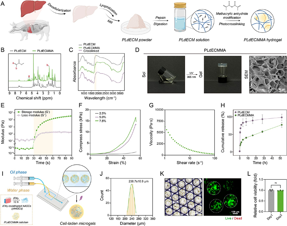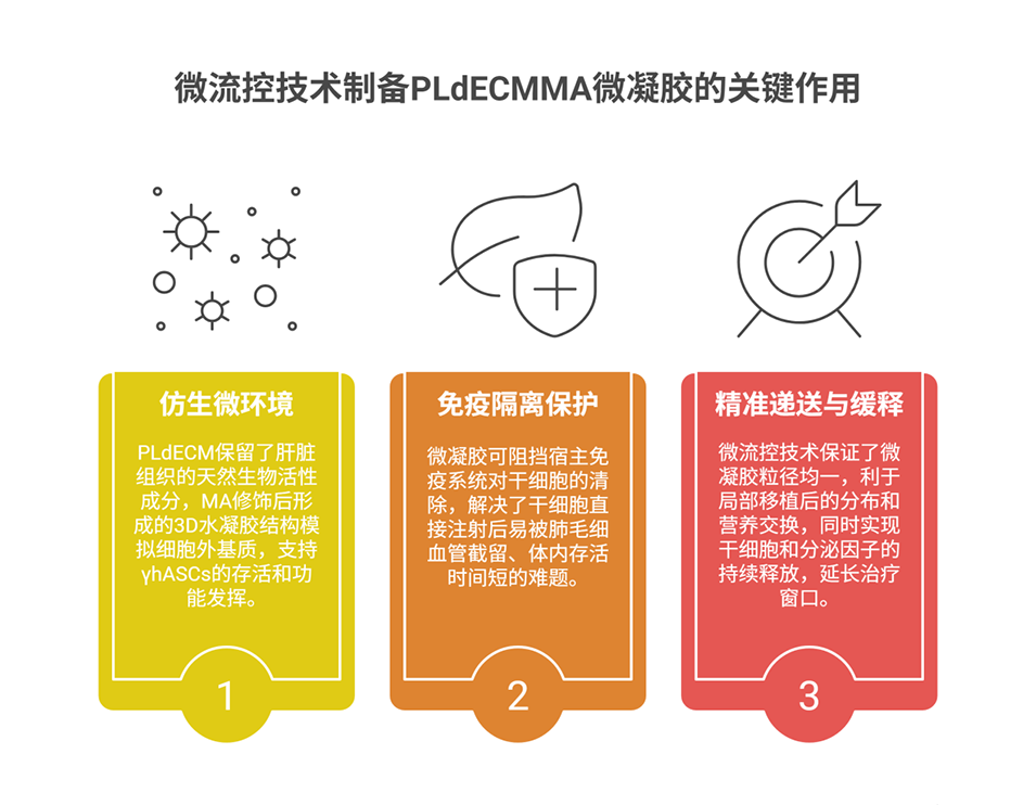 γhASCs负载微凝胶:采用微流控技术将IFNγ预处理的hASCs封装于PLdECMMA水凝胶中,微凝胶粒径均一(7±10.9μm),多孔结构利于营养交换。IFNγ预处理使hASCs分泌VEGF、IL-10等免疫调节因子的能力提升1.3-2.4倍,微凝胶封装则形成免疫保护屏障,延长细胞在病灶的存活时间。