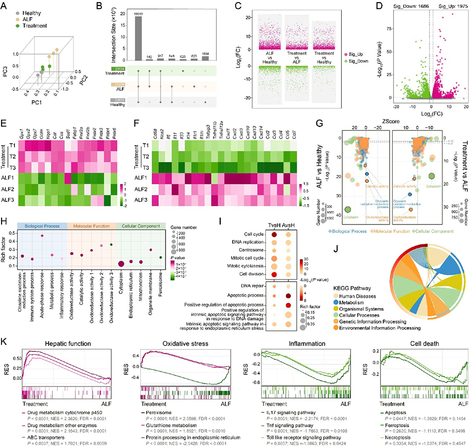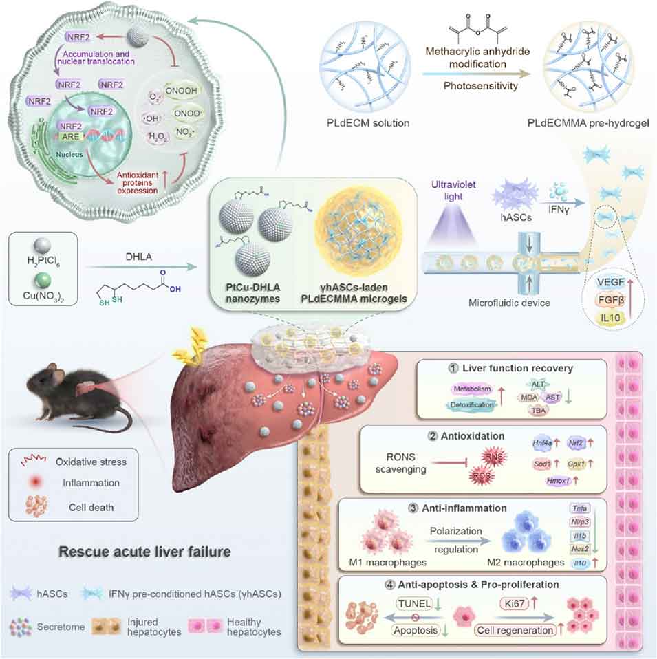 该研究创新性地将多功能纳米酶与干细胞治疗相结合,构建了兼具“环境调控”和“细胞修复”功能的生物活性dECM平台。通过PtCu-DHLA纳米酶改善病理微环境,γhASCs负载微凝胶强化细胞治疗效果,两者协同作用有效突破了ALF治疗的现有瓶颈。该方案不仅为急性肝衰竭提供了更高效、安全的治疗策略,也为再生医学领域中复杂疾病的协同治疗提供了重要借鉴,有望拓展至其他炎症相关疾病的治疗应用。