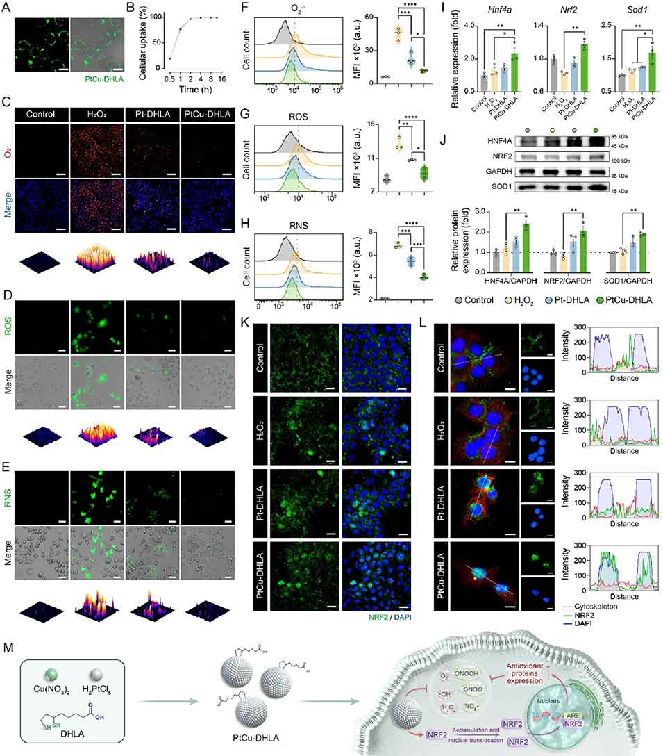 抗氧化:PtCu-DHLA直接清除RONS,同时激活NRF2信号通路,上调Hnf4a、Nrf2、Sod1等抗氧化基因表达,增强肝细胞内源性防御能力。