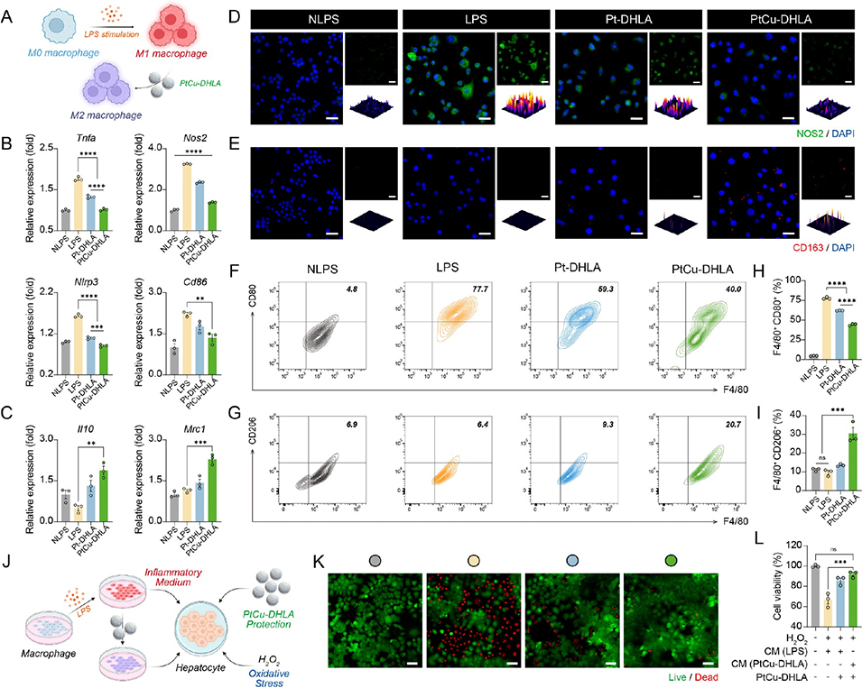 图3. PtCu-DHLA在脂多糖刺激巨噬细胞中的抗炎活性