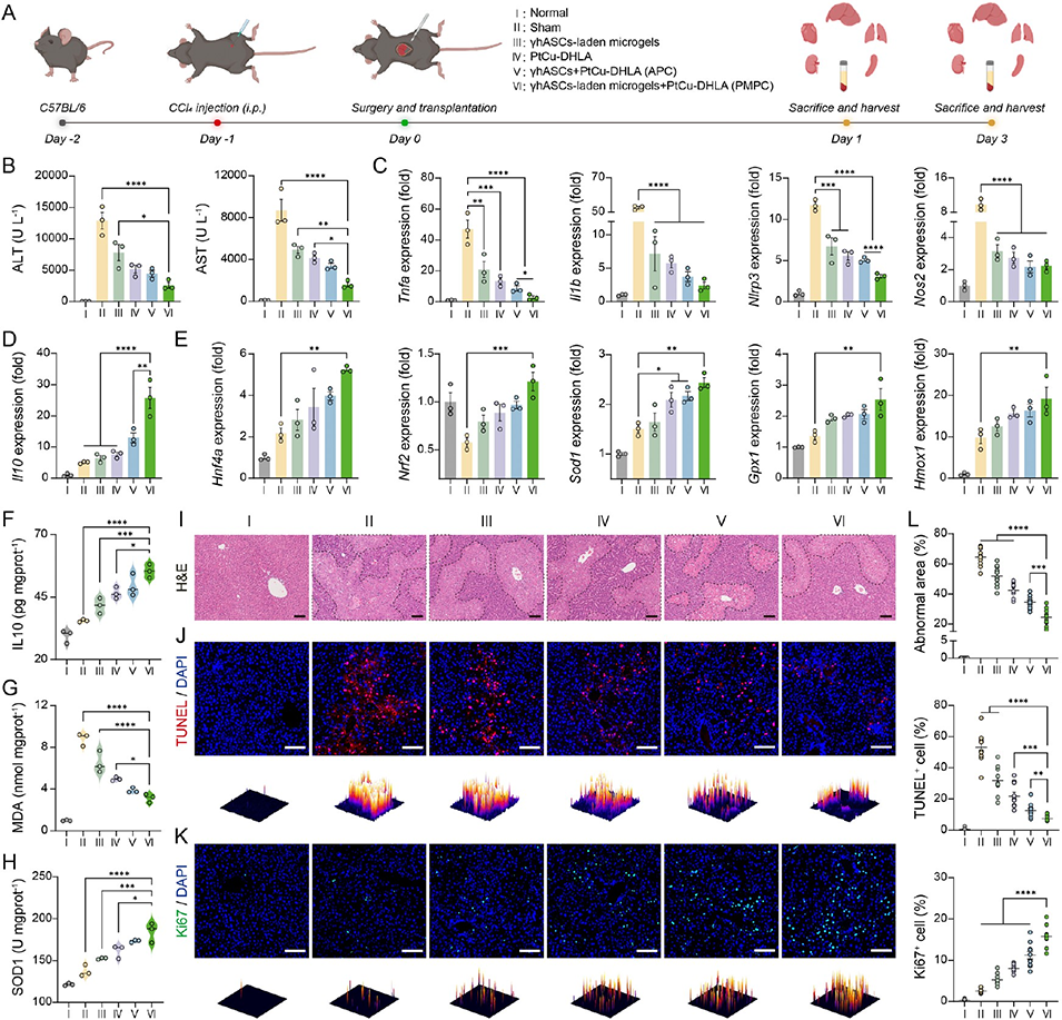 促修复:PtCu-DHLA促进肝细胞增殖(Ki67阳性率恢复)和血管生成(HUVEC迁移率达6%),γhASCs则通过旁分泌效应加速肝组织再生,减少肝细胞凋亡。