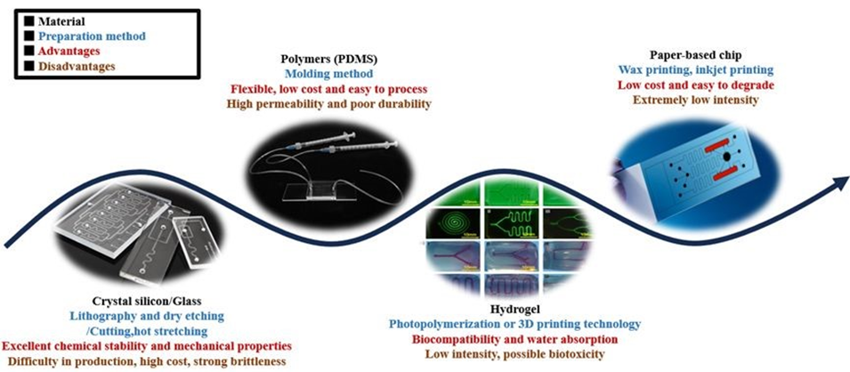 图2. 微流控芯片材料类型及特性:硅/玻璃-聚合物(聚二甲基硅氧烷)-水凝胶-纸基体系
