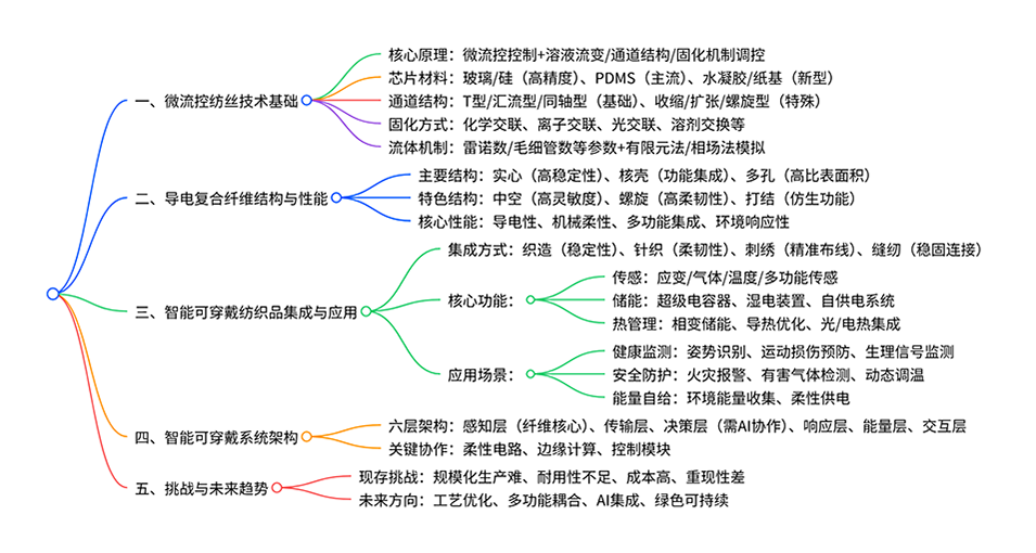2、重点聚焦微流控纺丝导电复合纤维的结构设计、制备策略及核心性能(如导电性、机械柔韧性和多功能集成能力)—— 这类纤维是智能纺织品的关键组成部分。