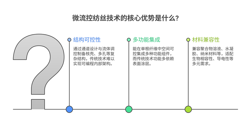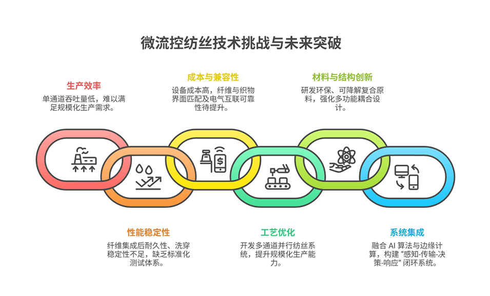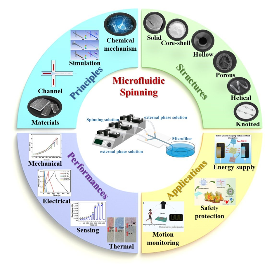 微流控纺丝技术是一种基于微流体控制原理的精准纤维制备技术。通过对纺丝溶液流变特性、微流控芯片通道结构及固化机制的精确调控,该技术能够实现对纤维形态、尺寸与成分的精准控制。近年来,其在智能穿戴设备领域展现出巨大应用潜力,有力推动了柔性电子、智能纺织品及人体健康监测技术的发展。