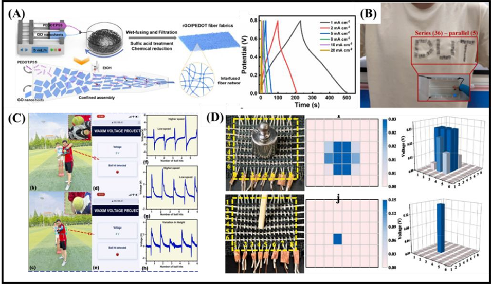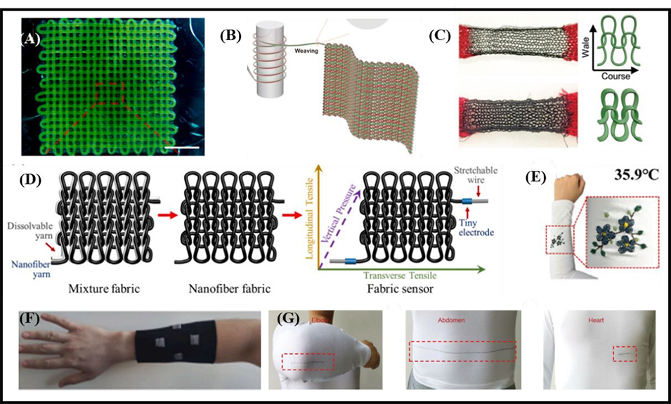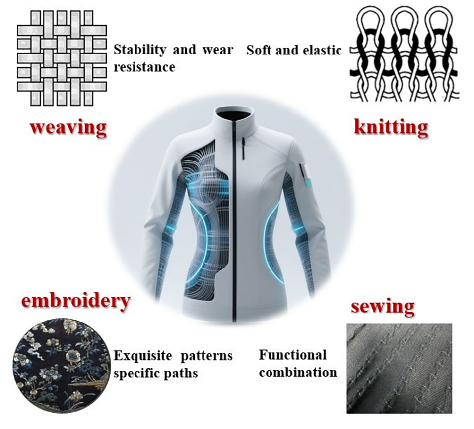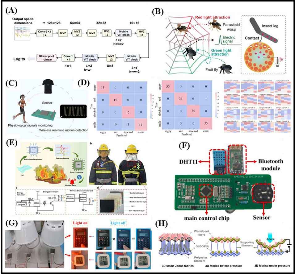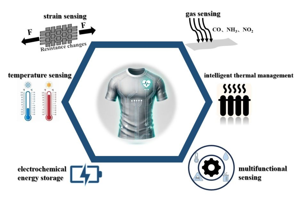 3、此外,还分析了这些功能纤维在智能穿戴纺织品中的应用场景,尤其是传感领域(如应变传感、气体传感、温度传感及多模态传感)、电化学储能领域和智能热管理领域,并探讨了纤维与织物的集成策略及“硬件-软件”一体化穿戴系统的构建。