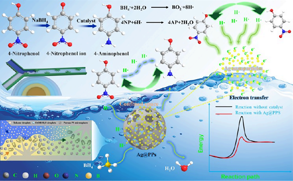 传统批量反应器制备多孔微球存在尺寸分布宽、孔径不均、形貌难控、需额外表面活性剂及设备复杂等问题,无法满足特定应用需求。基于此,西安交通大学郝南京教授团队提出了一种基于花状声学微反应器的微流控策略,成功实现了多孔聚苯乙烯微球的快速可控制备,其孔径可在176-354 nm范围内灵活调节。该团队进一步在微球上负载Ag纳米颗粒,所制备的Ag@PPS催化剂在4-硝基苯酚还原反应中表现出优异的催化活性和循环稳定性,为水环境有机污染物治理提供了新路径。相关研究以“Acoustic Microreactor-Enabled Controllable Production of Porous Microspheres toward Efficient Confined Catalysis”为题目,发表于期刊《ACS Applied Materials & Interfaces》。