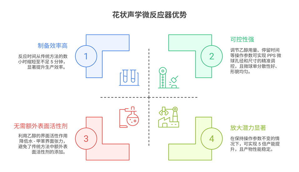 2、研究团队设计了类花状尖边声学微反应器,通过调控乙醇用量、流速、施加电压和停留时间等操作参数,可将PPS微球的孔径在176-354 nm范围内灵活调节,且反应时间从传统方法的数小时缩短至数分钟。