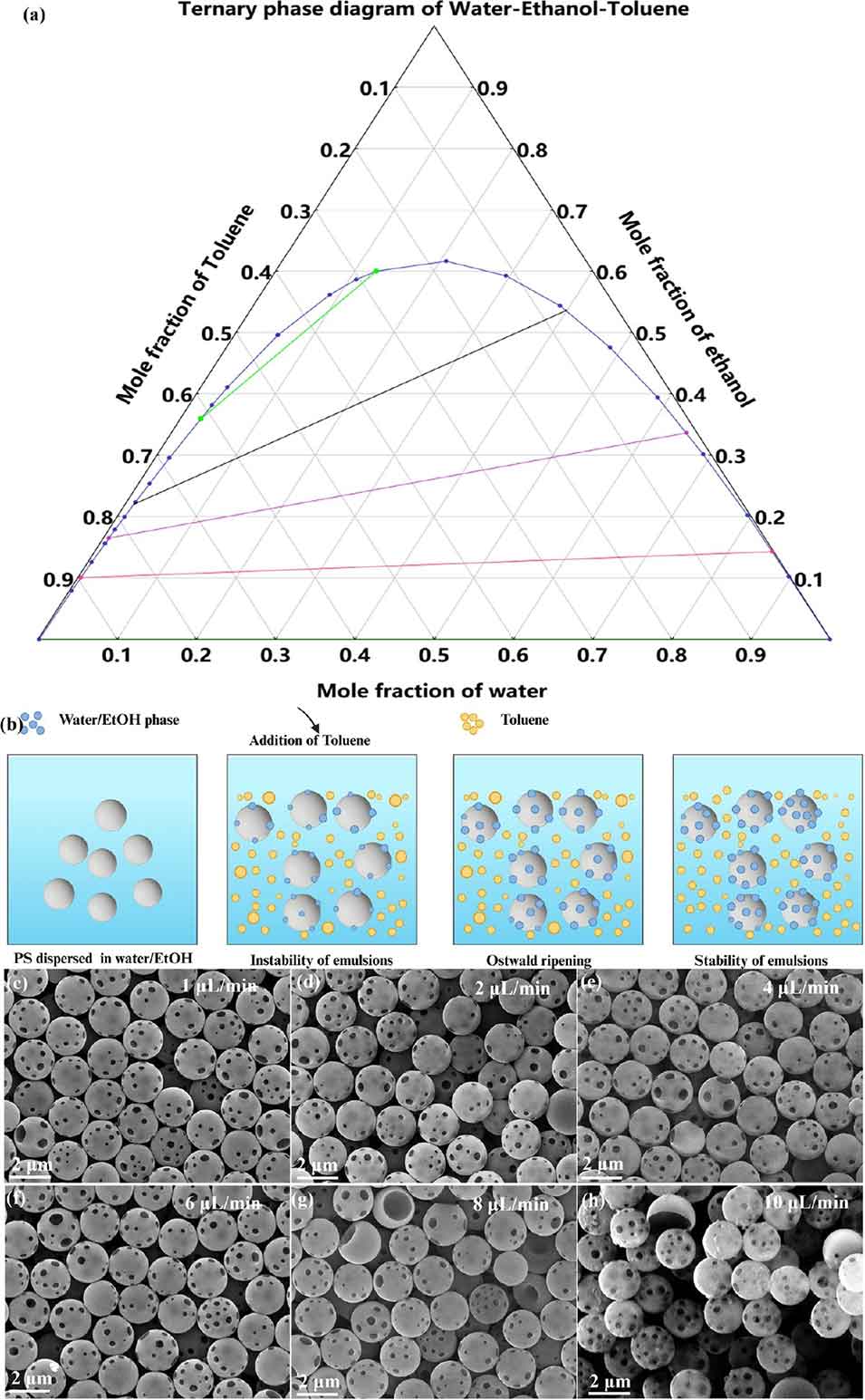 乙醇浓度<0.119 M(两相区):体系形成多分散大乳液,PPS微球孔径分布不均、形貌可控性差;