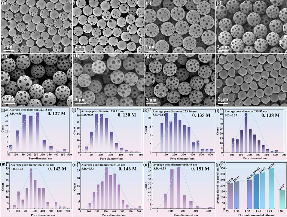 乙醇浓度127-0.151 M(纳米乳液区):体系形成稳定纳米乳液,PPS微球的孔数量和孔径随乙醇浓度增加而显著增大,孔径从222.18 nm增至354.24 nm,比表面积维持在较高水平(78.68 m²/g左右);
