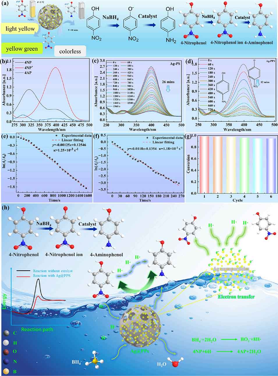 5、实验结果表明,Ag@PPS微球因具有超大比表面积、有序孔结构形成的受限微环境及丰富的活性位点,展现出优异的催化性能:10分钟内即可完成反应,准一级反应速率常数达1.18×10⁻² s⁻¹,周转频率(TOF)为907.78 h⁻¹,且经过5次循环使用后仍保持稳定的催化活性。